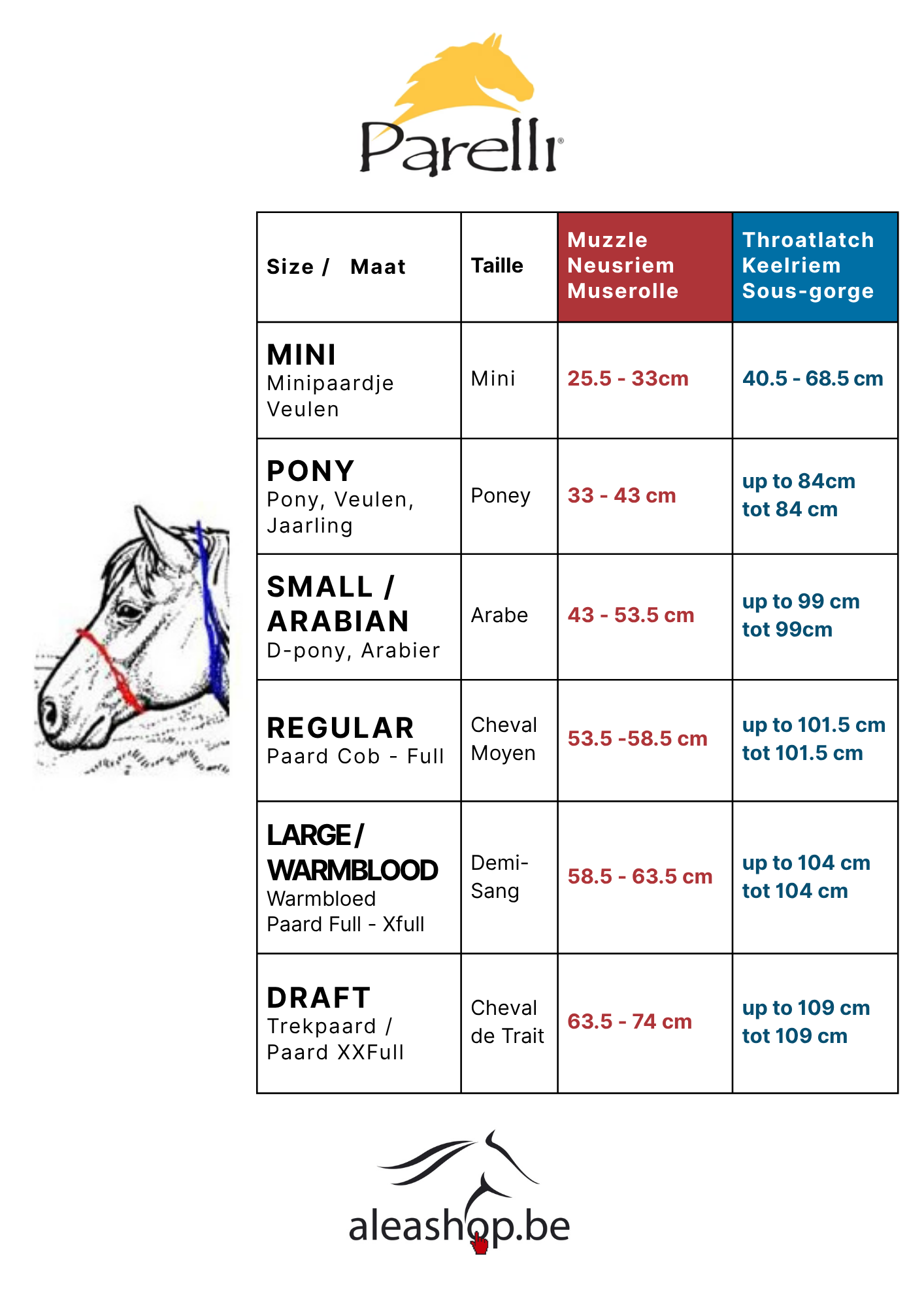 Maat Regular is de meest courante maat en past voor de meeste paarden, gaande van quarter, fjord of Haflinger tot de gemiddelde paarden van 1m65. Voor de grotere sportpaarden, paarden met een lang hoofd zoals bv. Friezen, kies je beter de maat Warmbloed. De maat Pony in de Parelli halster valt redelijk klein uit, voor D-pony's bv. past de maat Arabian soms beter. Trekpaard is de grootste maat. Mini is echt heel klein, enkel geschikt voor minitauurpaardjes of zeer jonge veulentjes.