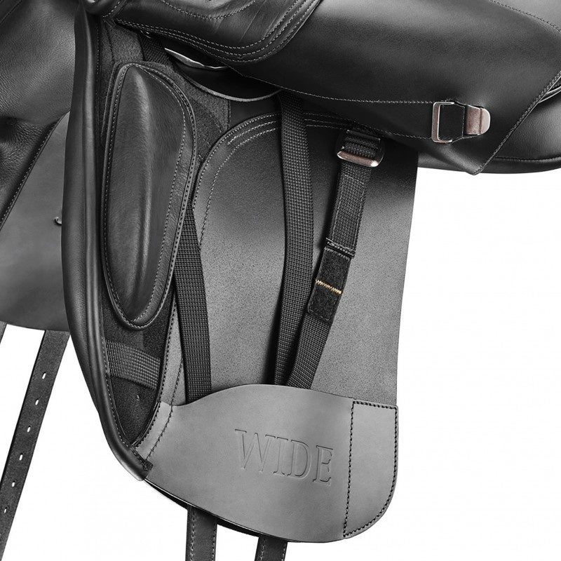 The Bates WIDE Dressage Saddle is a dressage saddle specifically designed for wider horses. Its performance-driven deep seat delivers unparalleled comfort and a connection with your horse never before experienced in a WIDE saddle. The deeper seat and ultra-narrow waist allow you to sit deeper in the saddle, supporting a well-balanced, central position. For your horse, an ultra-thin panel, wide chamber, large, even support surface, and adjustable Y-girth ensure optimal saddle stability and freedom of movement for a comfortable fit.