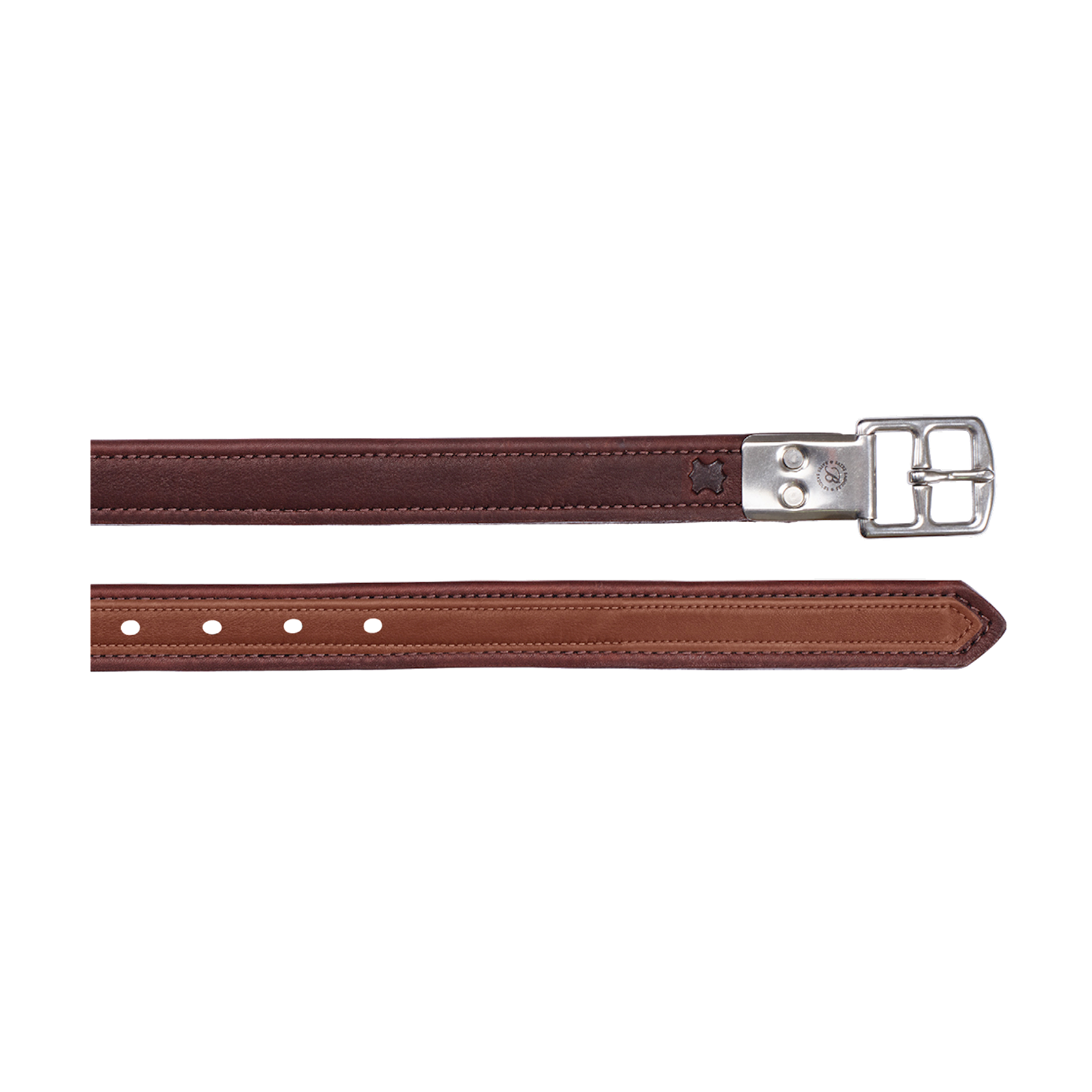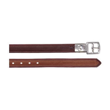 Luxueuze stijgbeugelriemen van topkwaliteit vaarsleder, geteste breuksterkte meer dan een halve ton. Roestvrij stalen gespen met klinknagels om de lederdikte onder het been van de ruiter te verminderen.