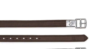 Luxueuze stijgbeugelriemen van topkwaliteit vaarsleder, geteste breuksterkte meer dan een halve ton. Roestvrij stalen gespen met klinknagels om de lederdikte onder het been van de ruiter te verminderen.